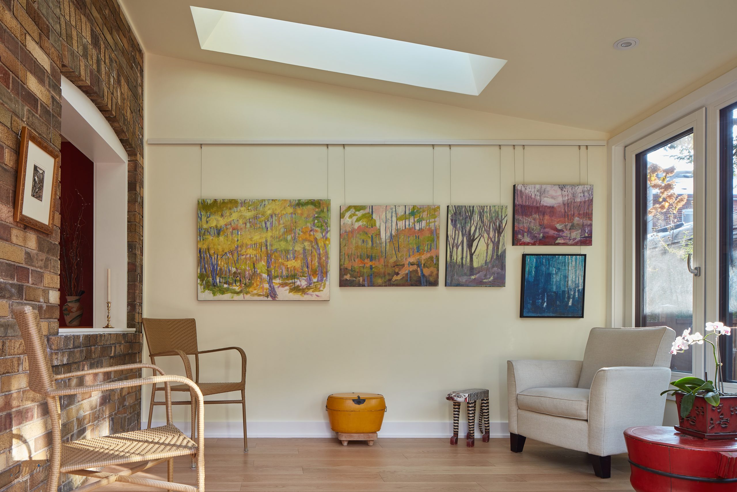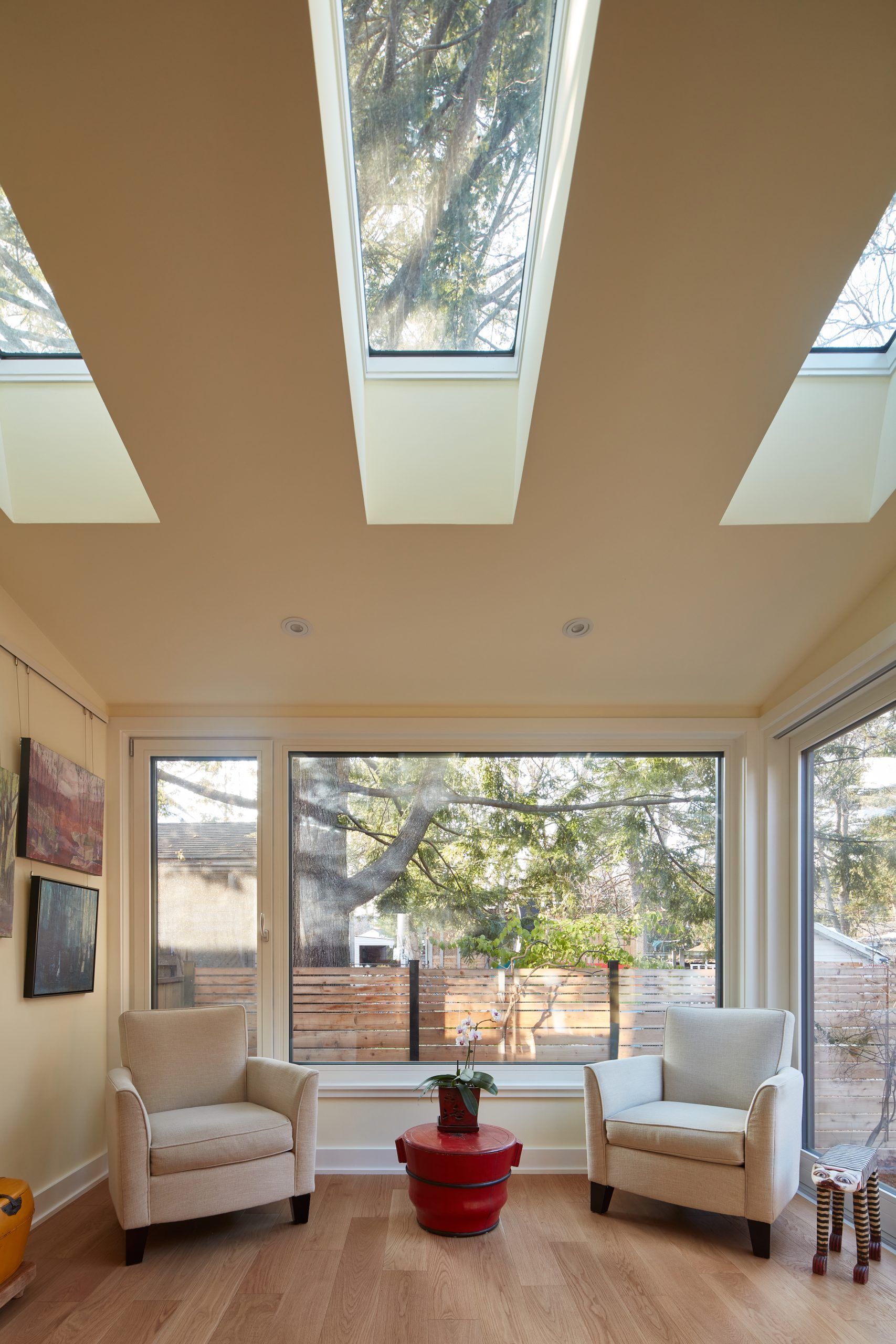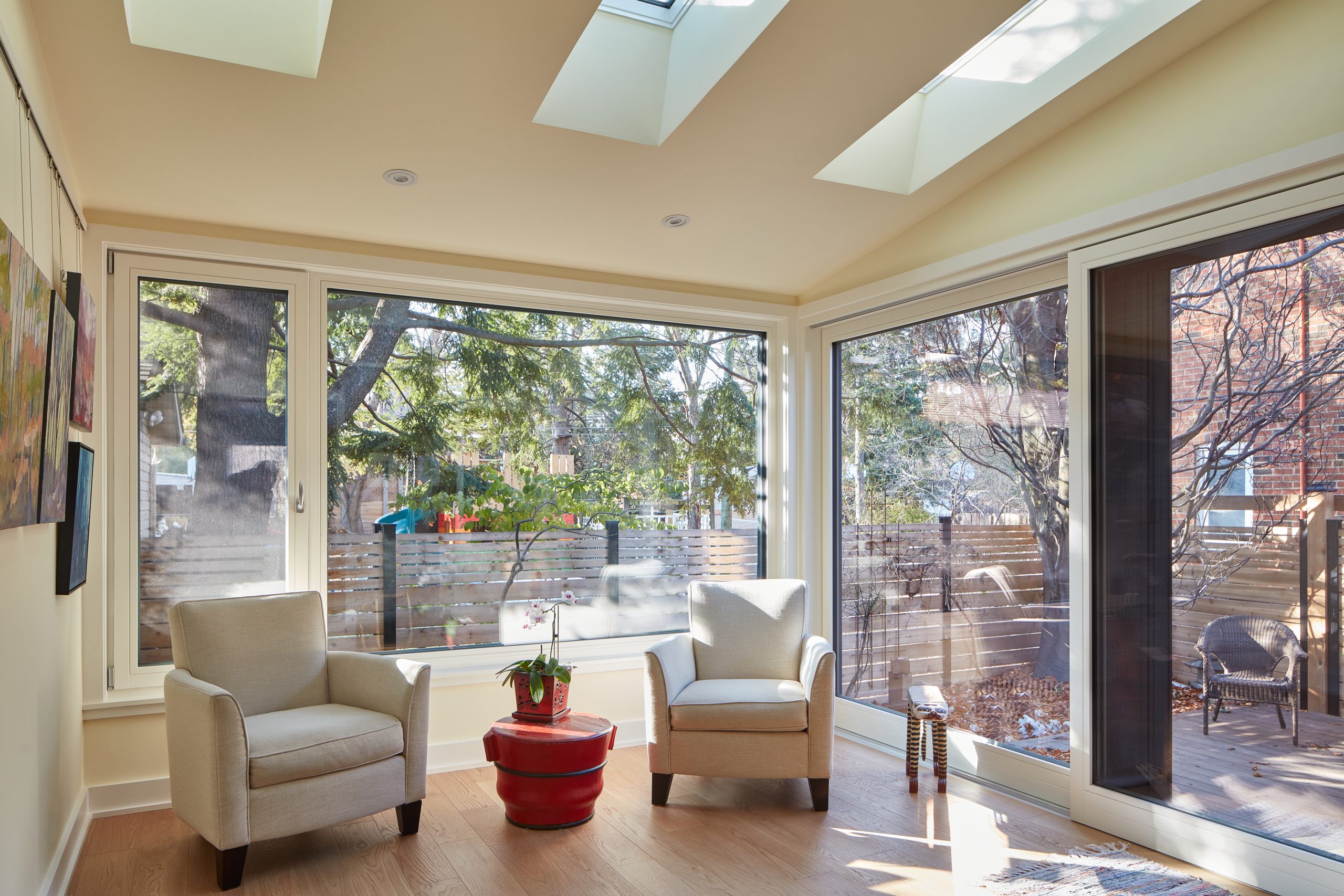 On a tight midtown lot, a failing 1970s sunroom—unusable for half the year—was transformed into a luminous, four-season retreat. The clients envisioned more than just extra space: a place to live among their art and greenery year-round, blurring the line between indoors and out.