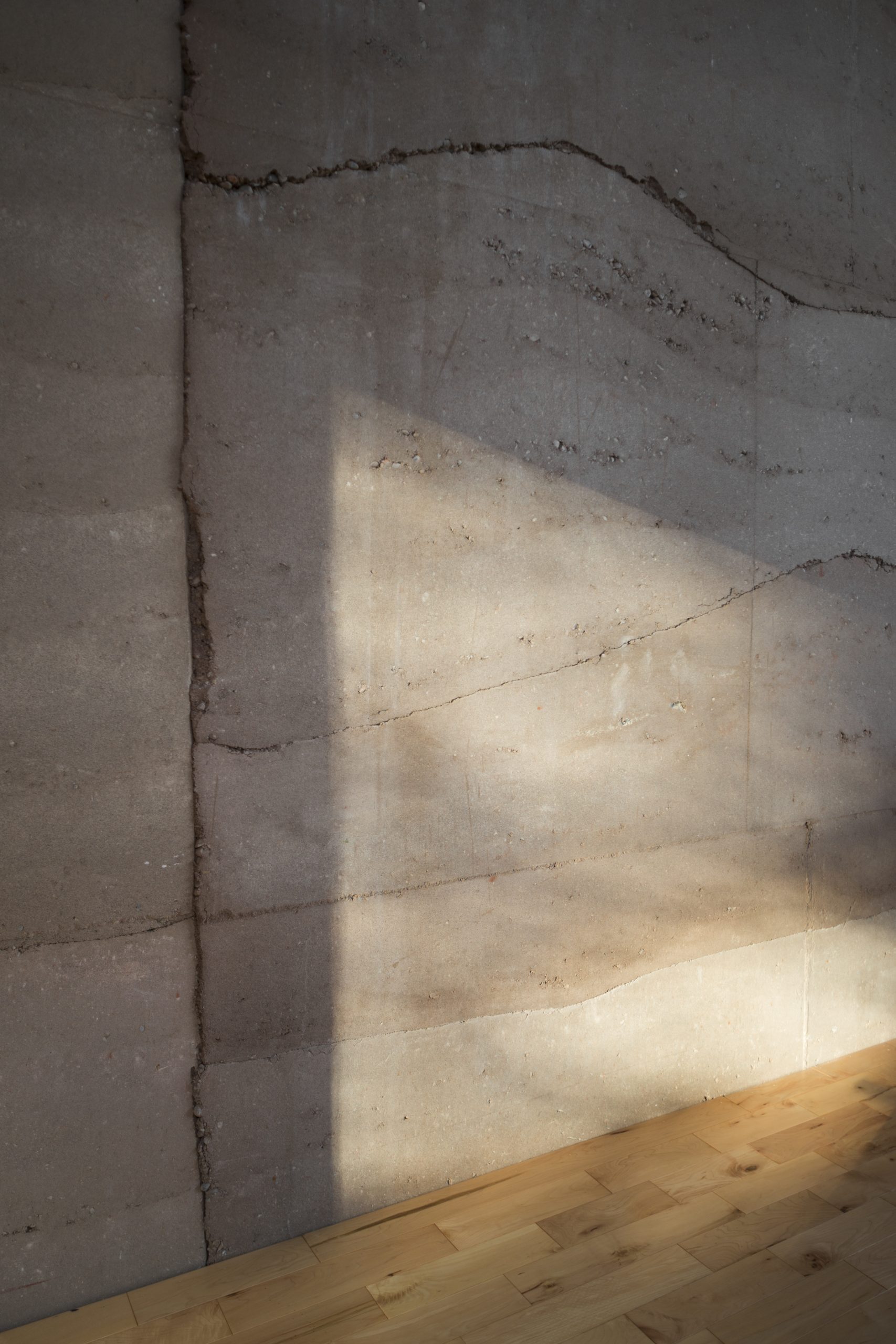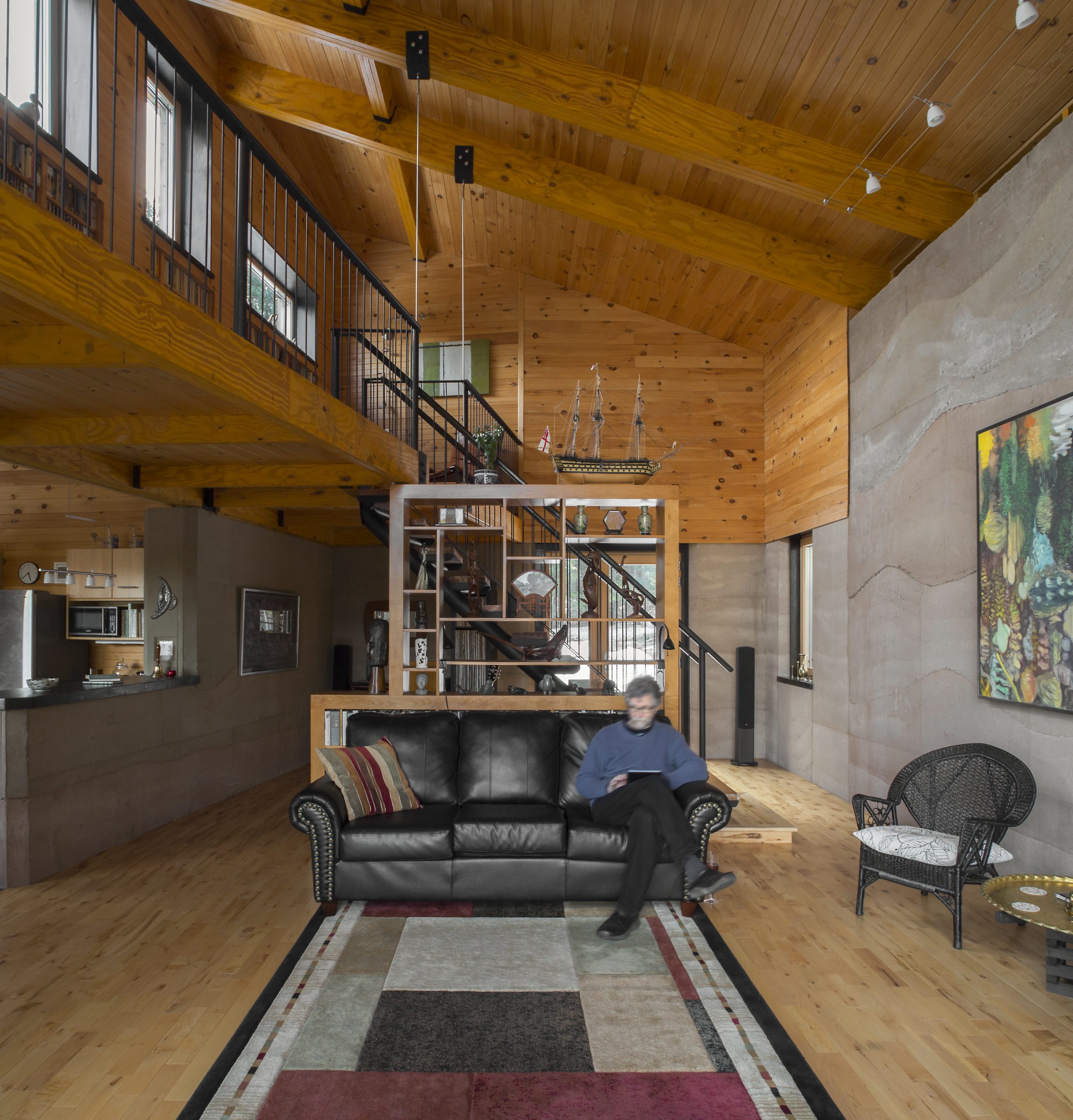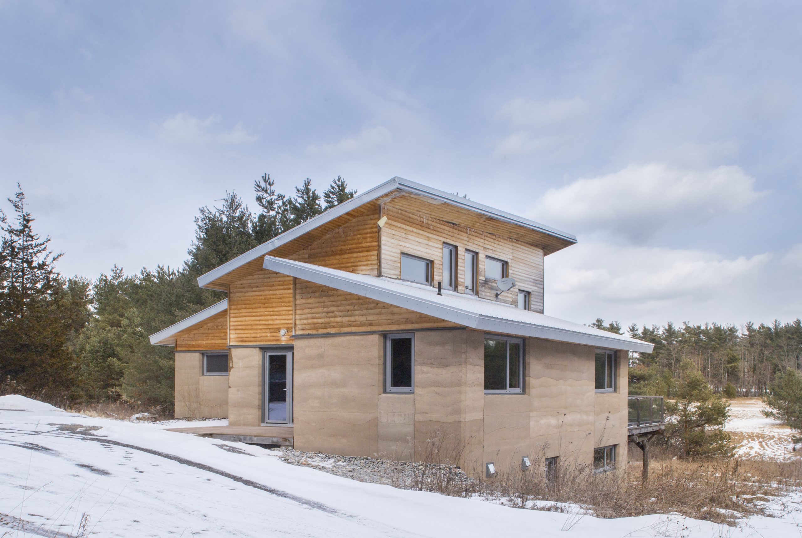 Ontario's first insulated rammed earth home is set into an east facing hill near Castleton, Ontario. To capture more light, the east and west portions of the building were pulled apart, allowing the central double height space to extend above the roof letting solar light and heat flood in. The house uses approximately 20kW/h/m2 to heat annually or almost Passive House efficient. The thermal mass of rammed earth ensures that air conditioning is not required.