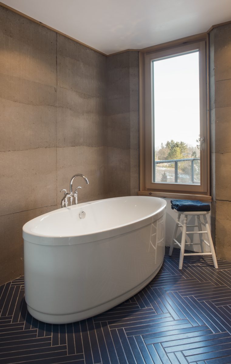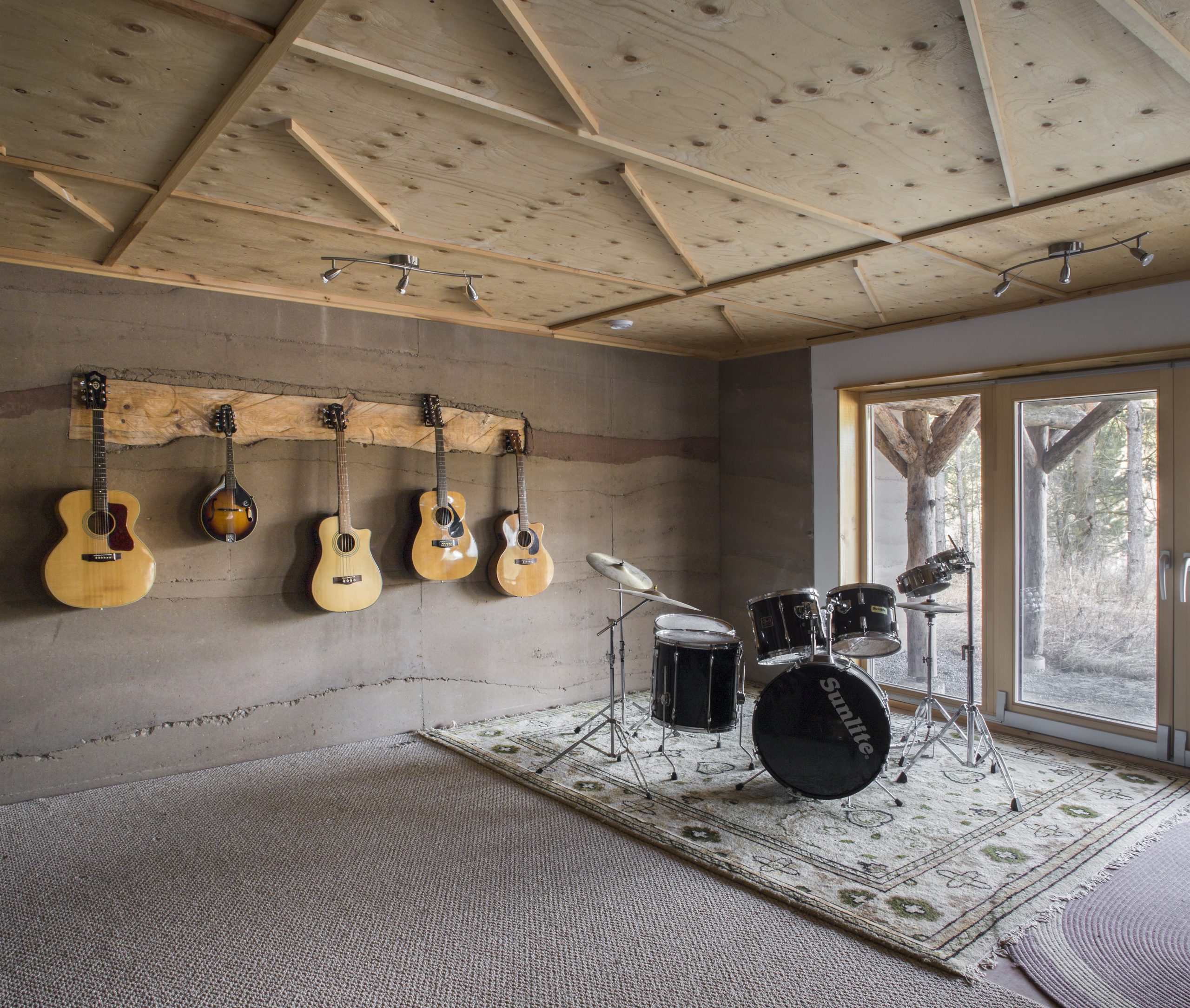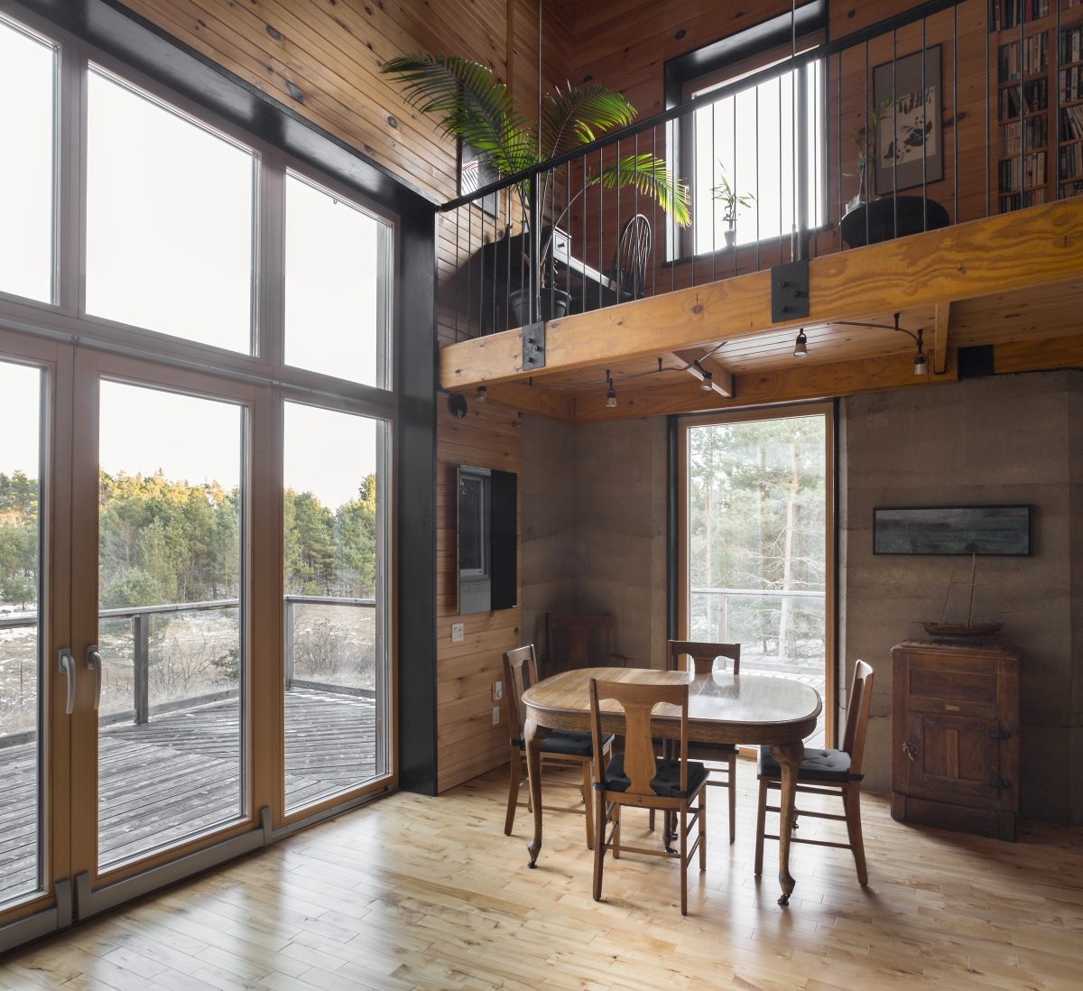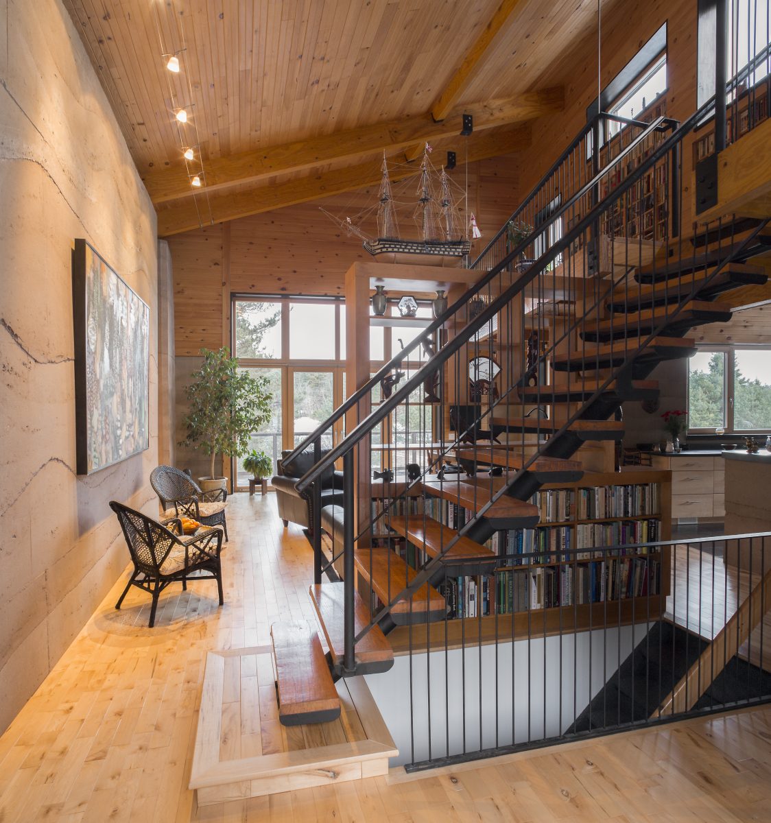 Ontario's first insulated rammed earth home is set into an east facing hill near Castleton, Ontario. To capture more light, the east and west portions of the building were pulled apart, allowing the central double height space to extend above the roof letting solar light and heat flood in. The house uses approximately 20kW/h/m2 to heat annually or almost Passive House efficient. The thermal mass of rammed earth ensures that air conditioning is not required.