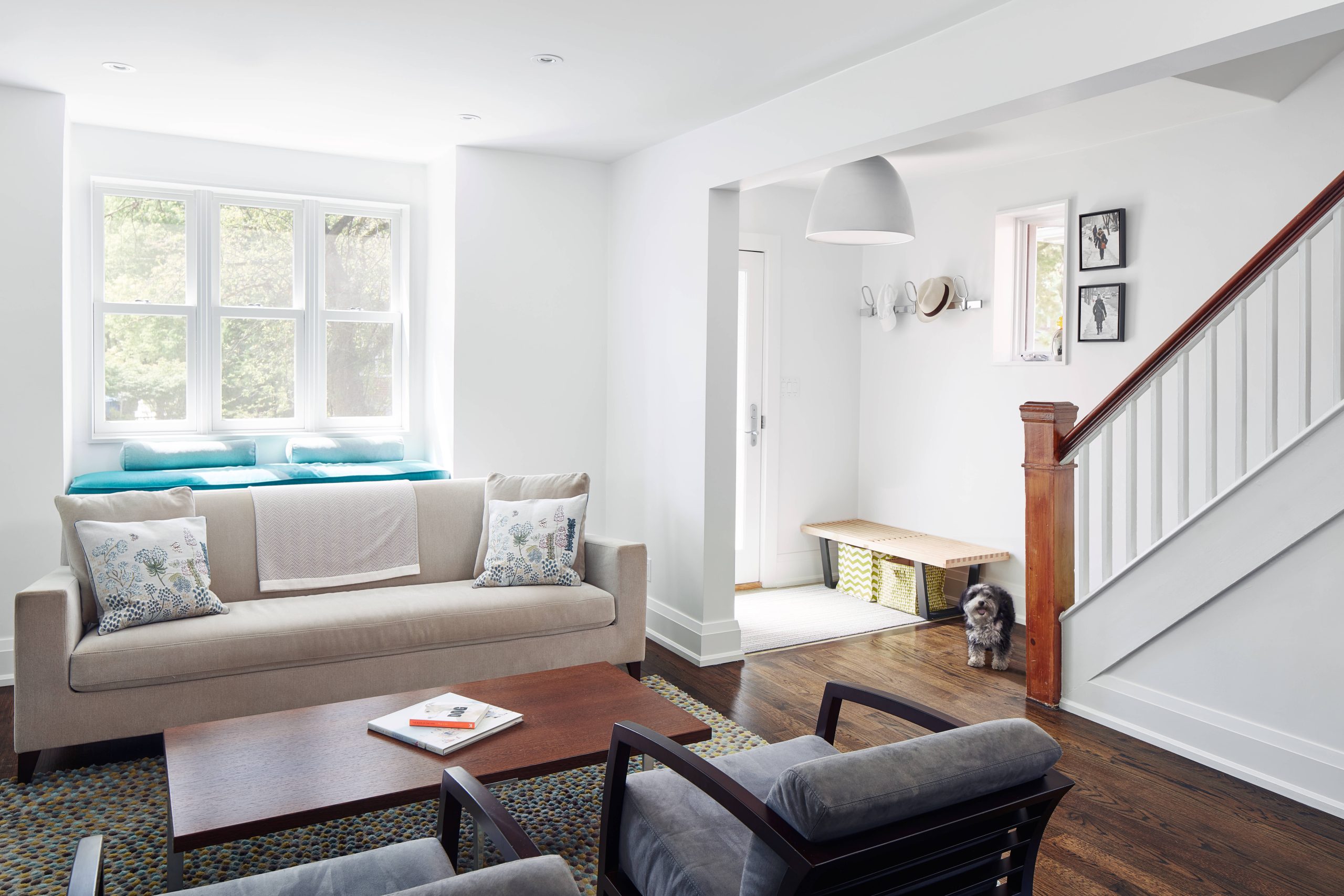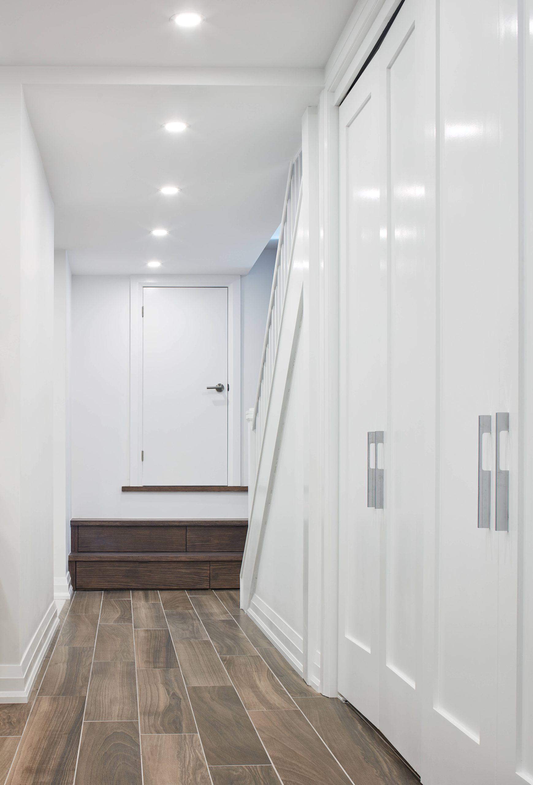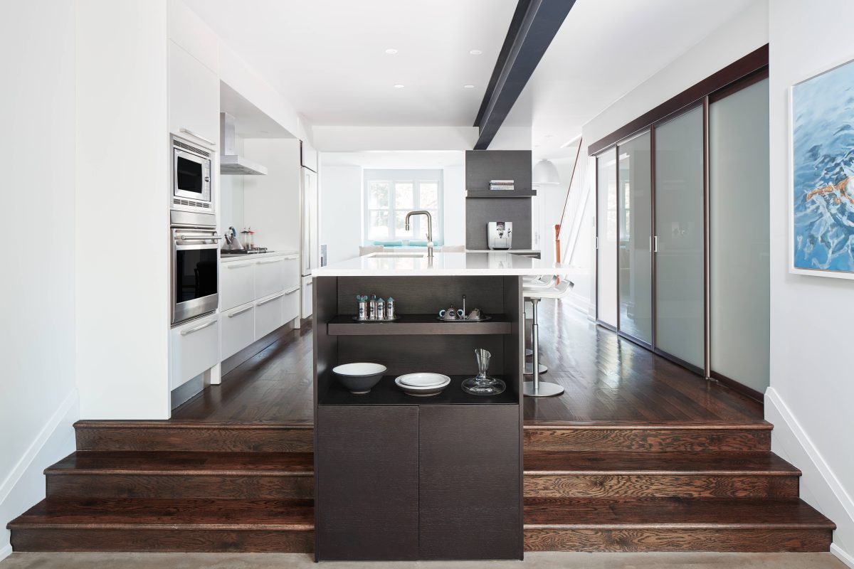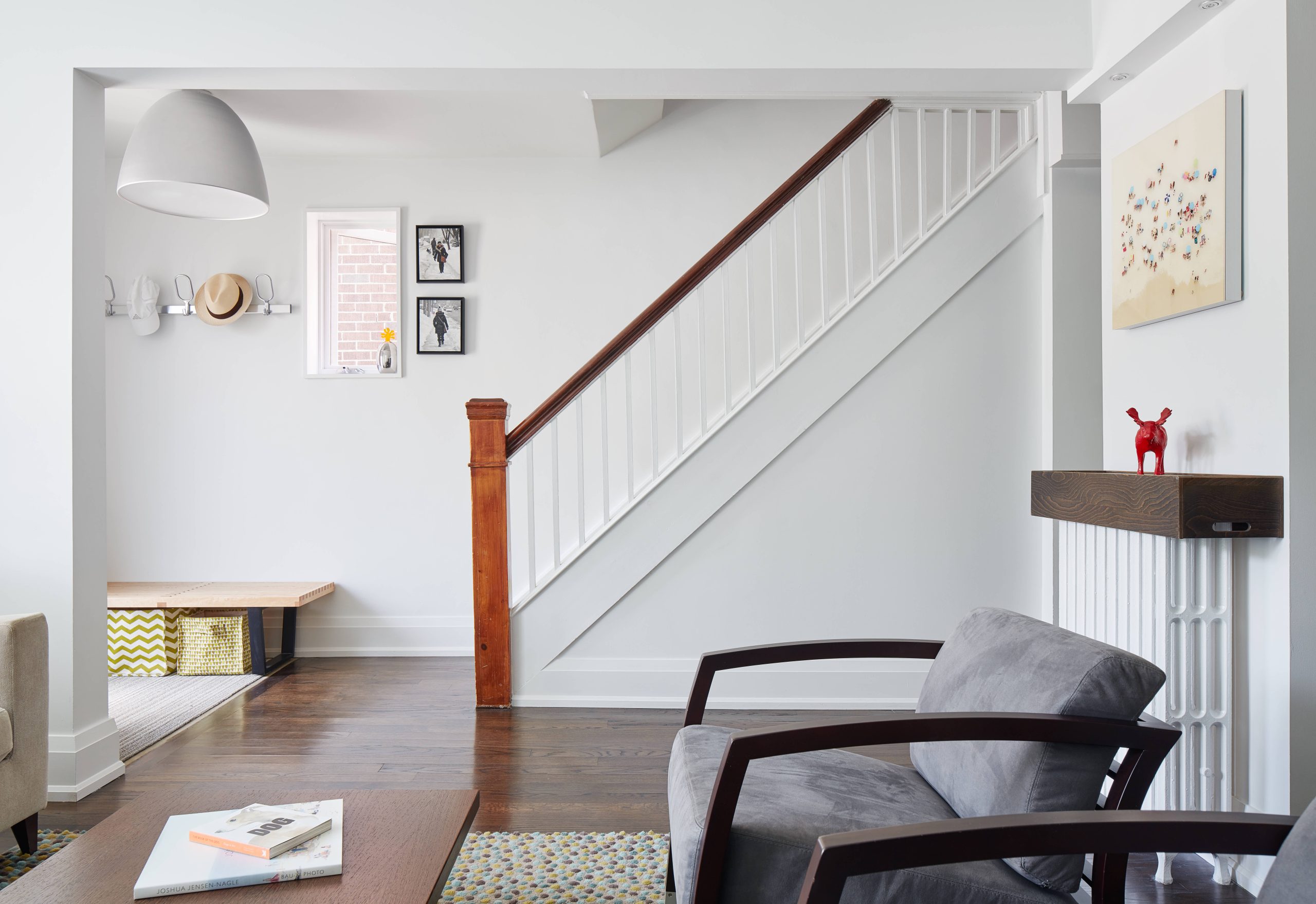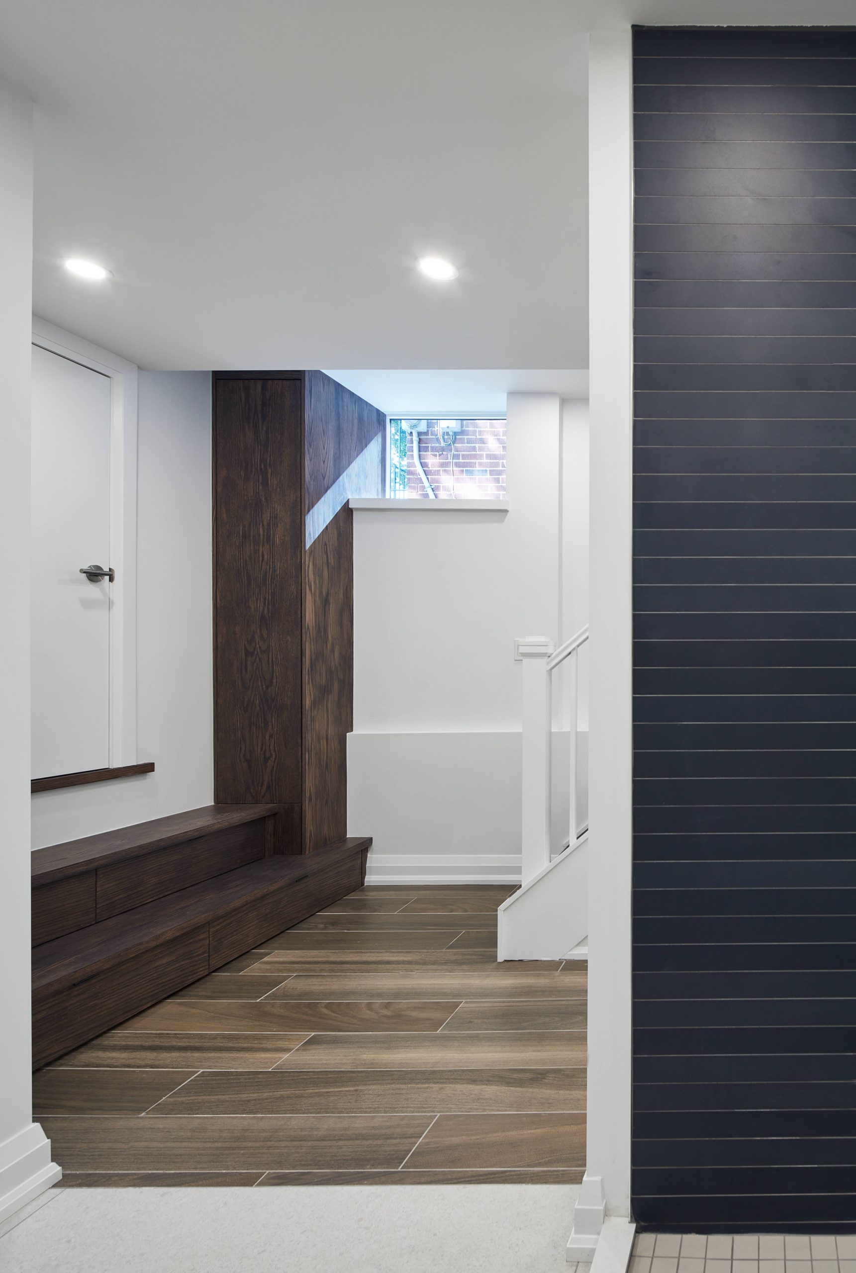 The owners wanted to update their front garden to reflect their modern taste. Taking queues from the existing Bauhaus front door, a modern box bay window clad in Parklex was conceived. Cedar strip walls enclose the front garden providing a more eventful entry. Next we created 3 custom bathrooms and made the ground floor continuous oak. A beautiful glass railing connects all three floors.