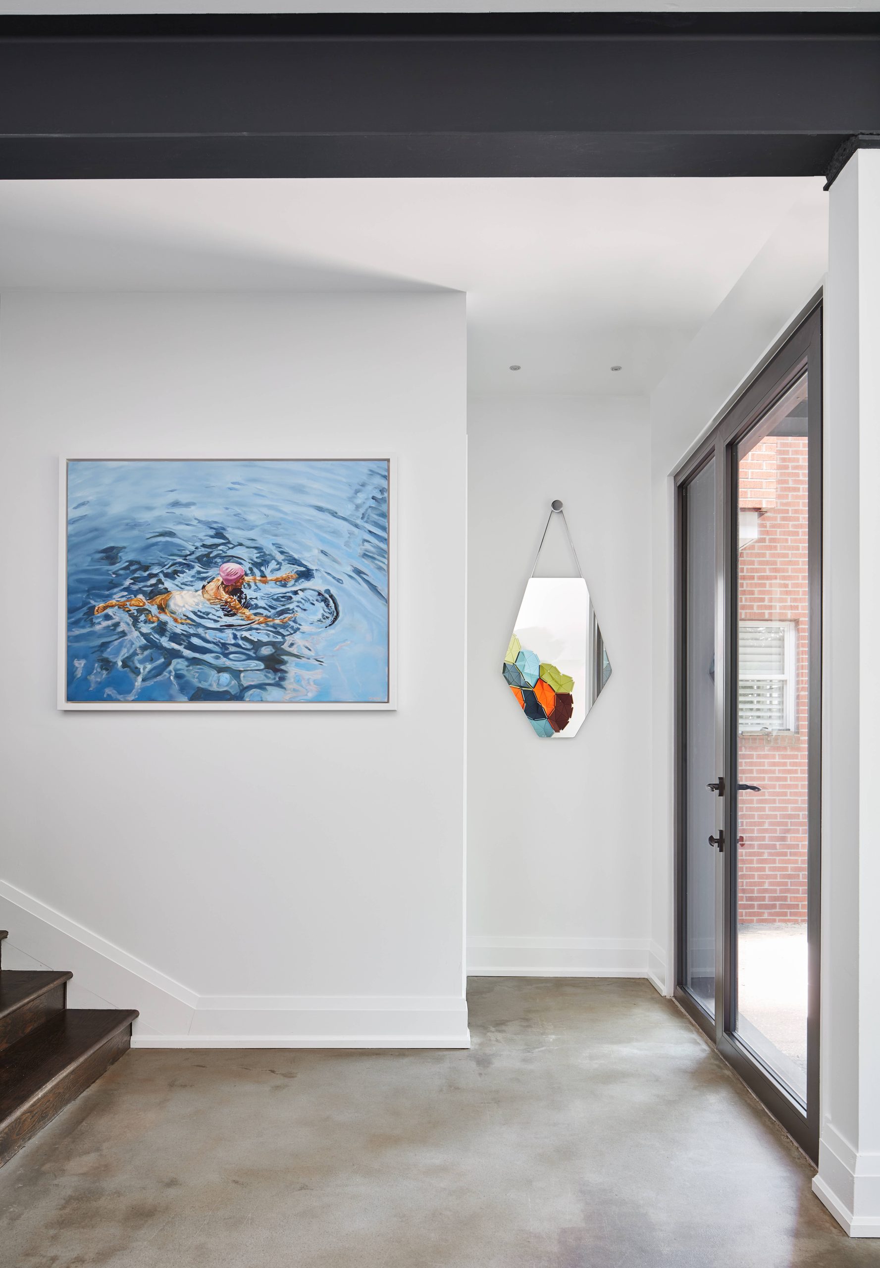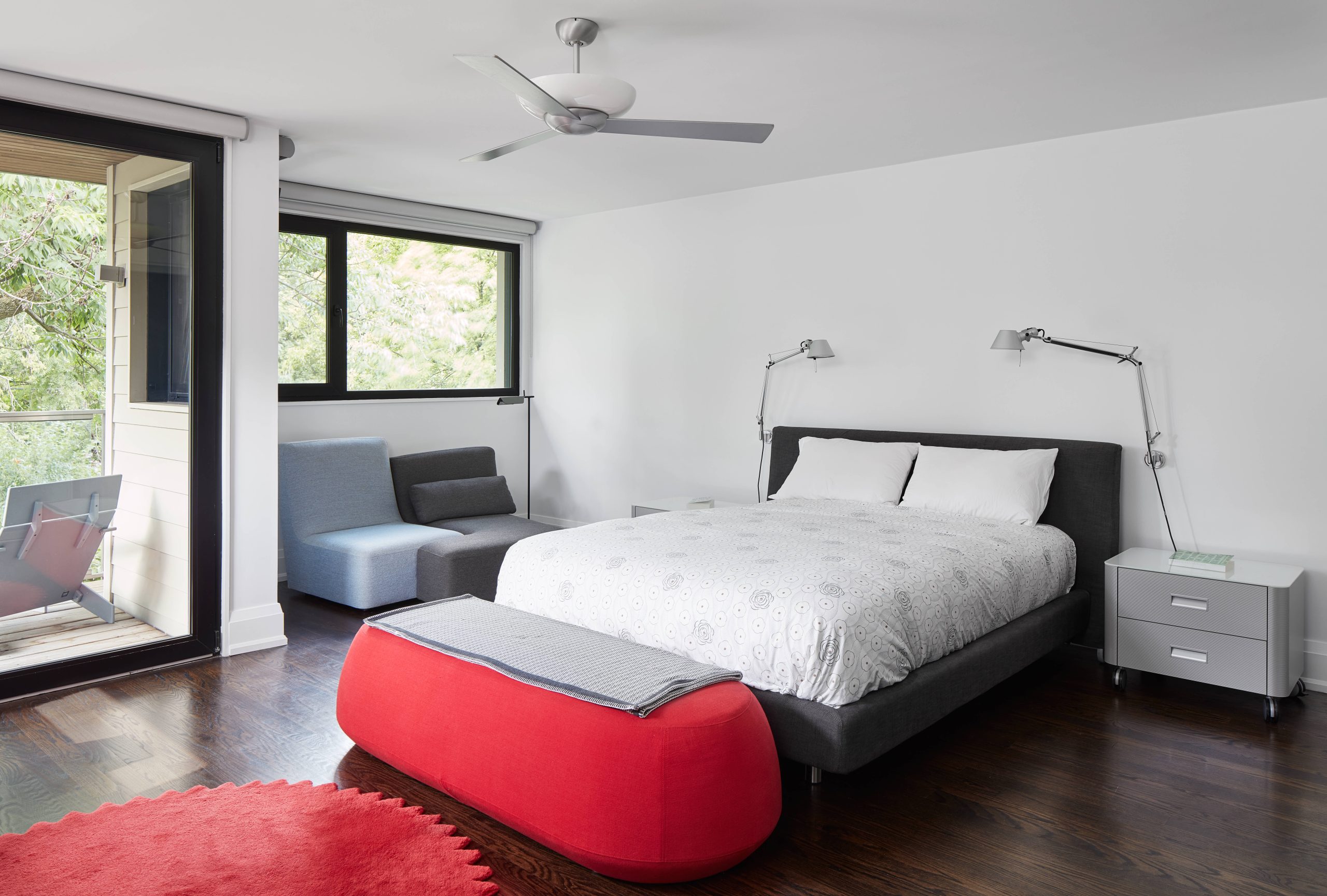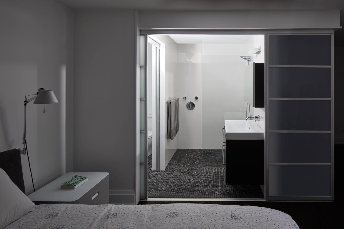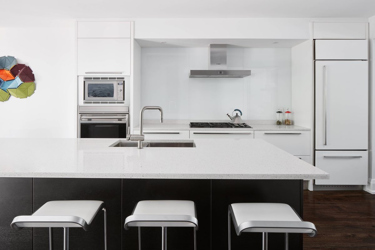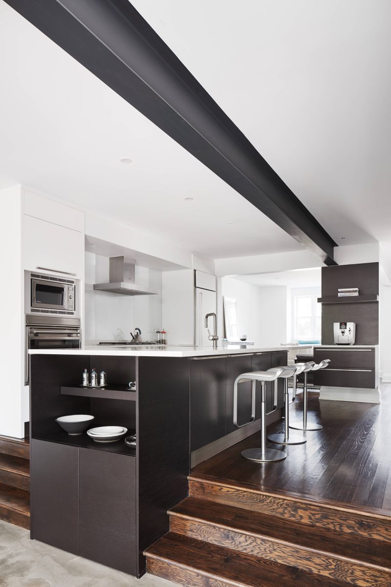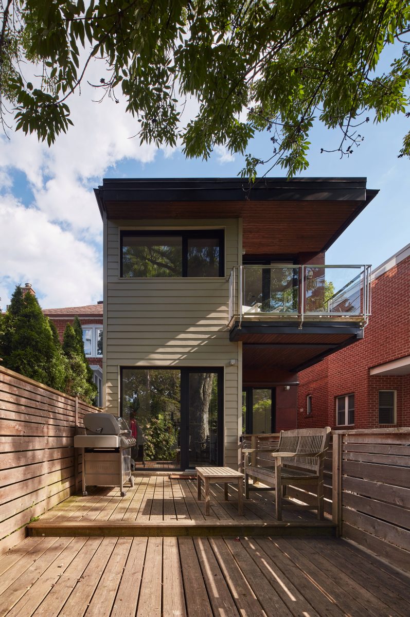 The owners wanted to update their front garden to reflect their modern taste. Taking queues from the existing Bauhaus front door, a modern box bay window clad in Parklex was conceived. Cedar strip walls enclose the front garden providing a more eventful entry. Next we created 3 custom bathrooms and made the ground floor continuous oak. A beautiful glass railing connects all three floors.